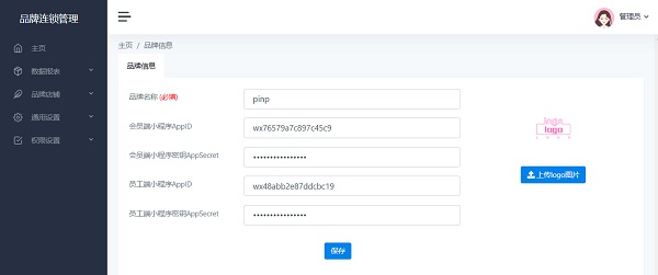 保存品牌名称和磐达健身管理系统会员端小程序和员工端小程序AppID 和AppSecret (小程序必须)