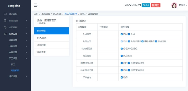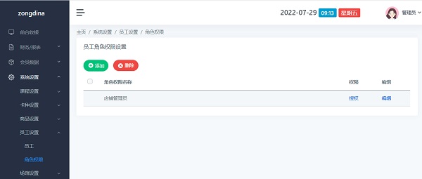 角色名词解释:指员工在分店担任的是什么角色(如:前台、会籍、店长等职务),角色需要设置角色拥有的权限。拥有某一角色的的员工(添加员工需要选择某一角色)都将拥有这一角色的所有权限。