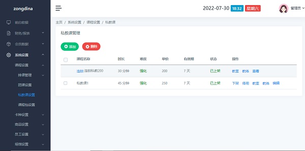 私教课设置操作包括添加、修改、删除、上架/下架、启用/停用、设置上课教练、设置上课教室。