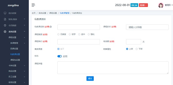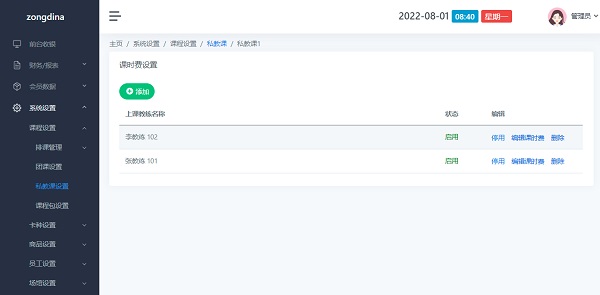 打开路径:点击左侧菜单 系统设置>课程设置>私教课设置