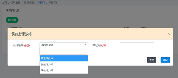 先选择上课的教练,然后添加教练上课课时费,最后点击“确定”按钮,添加上课教练完成。