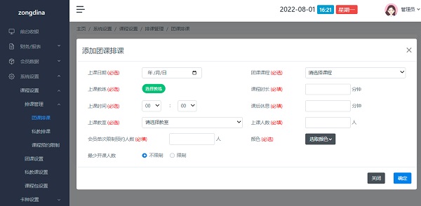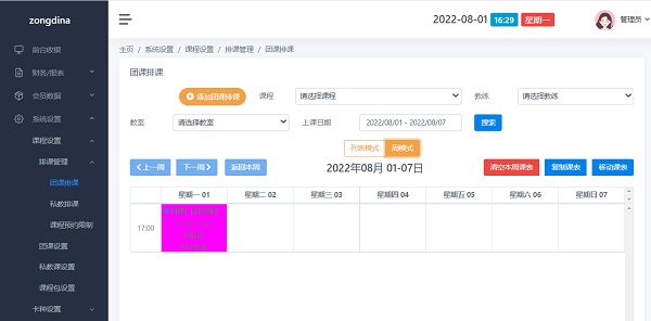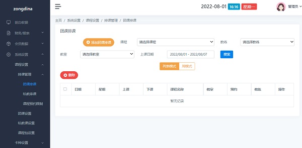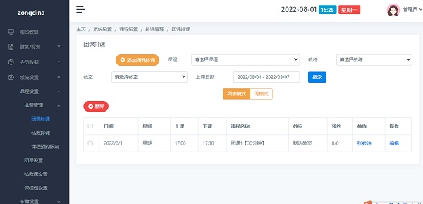 打开路径:点击左侧菜单 系统设置>课程设置>排课管理>团课排课